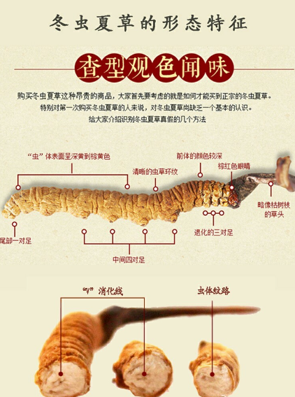 冬蟲夏草在密封后打開,聞起來有淡淡的腥氣味,淡草茹味??傊x夏草入藥時須“草、蟲”兼?zhèn)洌幮苑郊?,倘若缺一,則療效難全。若遇殘缺不全的蟲草,或只有蟲體而無子座,或只有子座而無蟲體;均為次品,此點最為重要,切勿忘記。在購買藥用冬蟲夏草時,應(yīng)選擇色澤正常、發(fā)育良好、無病蟲害、無殘缺、無畸形、質(zhì)地良好而又干爽者。
