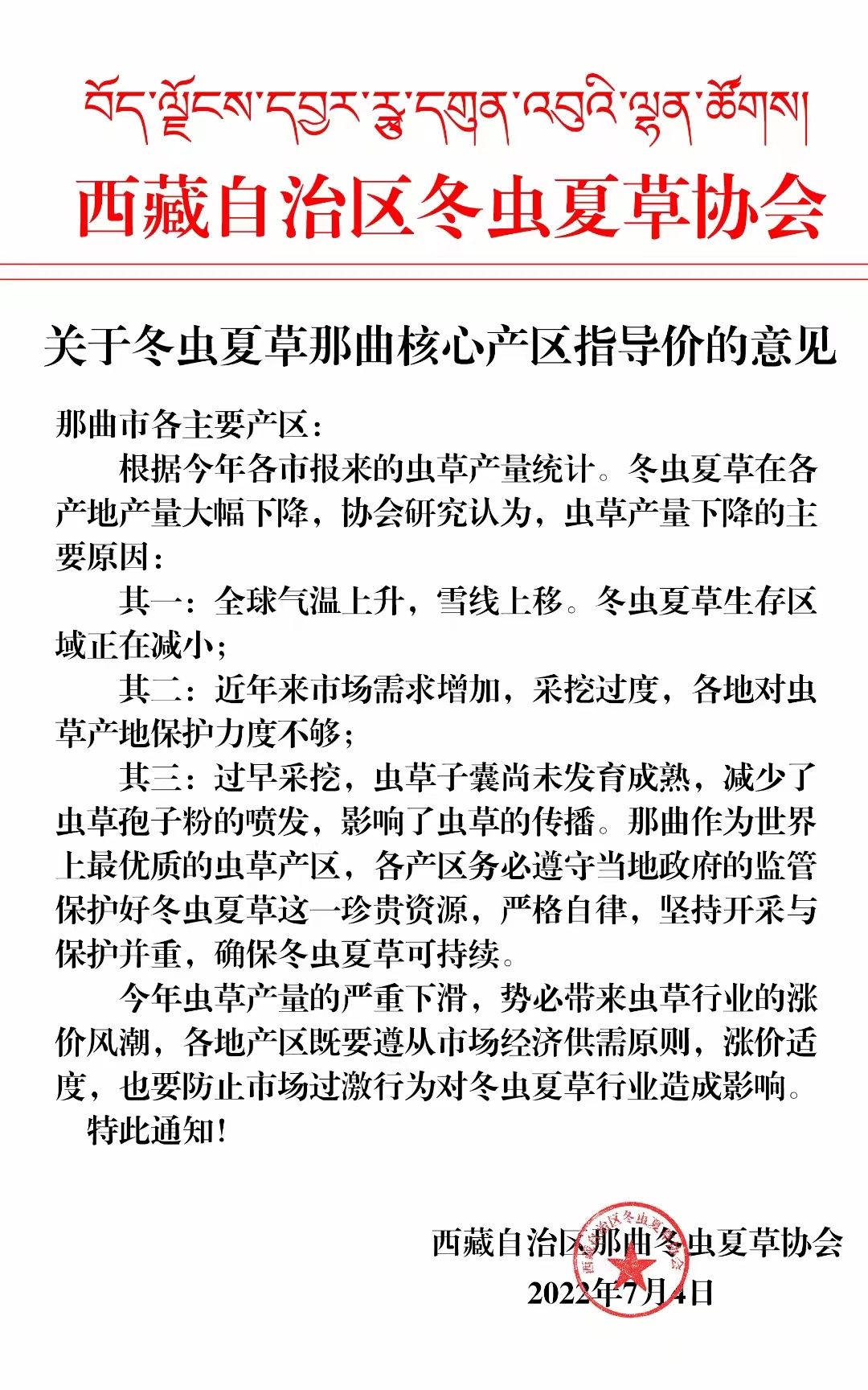 那曲作為世界上最優(yōu)質(zhì)的蟲(chóng)草產(chǎn)區(qū),各產(chǎn)區(qū)務(wù)必遵守當(dāng)?shù)卣谋O(jiān)管保護(hù)好冬蟲(chóng)夏草這一珍貴資源,嚴(yán)格自律,堅(jiān)持開(kāi)采與保護(hù)并重,確保冬蟲(chóng)夏草可持續(xù)。今年蟲(chóng)草產(chǎn)量的嚴(yán)貢下滑,勢(shì)必帶來(lái)蟲(chóng)草行業(yè)的漲價(jià)風(fēng)潮,各地產(chǎn)區(qū)既要遵從市場(chǎng)經(jīng)濟(jì)供需原則,漲價(jià)適度,也要防止市場(chǎng)過(guò)激行為對(duì)冬蟲(chóng)夏草行業(yè)造成影響。特此通知!