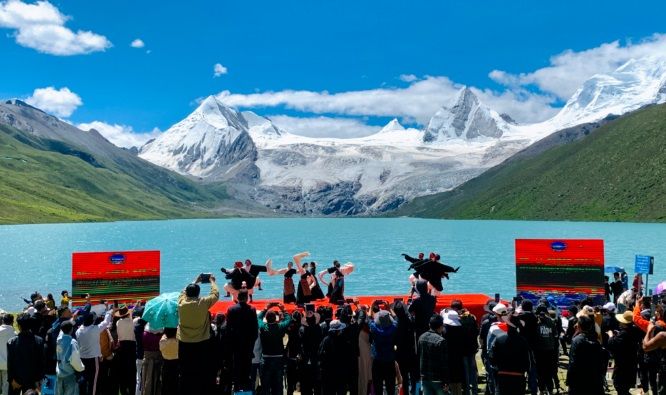 天高地闊,白云祥和,雪山巍然;清風(fēng)徐徐,青草依依,湖水湛藍(lán)。薩普雪山融水匯聚成一條清澈的河,從眼前激流直下。7月15日上午,一場(chǎng)別具特色的文化旅游賽事活動(dòng)在這里拉開(kāi)序幕。一場(chǎng)慷慨激昂、內(nèi)容豐富的主題推介演講,一首首悠揚(yáng)高亢、直擊心靈的民族歌曲,一幕幕輕盈靈動(dòng)、鏗鏘有力的特色舞姿,引得現(xiàn)場(chǎng)數(shù)百名觀眾一陣陣掌聲雷動(dòng)和直播間數(shù)十萬(wàn)用戶點(diǎn)贊、好評(píng)不斷,成功向區(qū)內(nèi)外推介了比如縣得天獨(dú)厚的旅游資源和特產(chǎn)資源,為旅游事業(yè)和經(jīng)濟(jì)社會(huì)高質(zhì)量夯實(shí)了宣傳工作基礎(chǔ)。