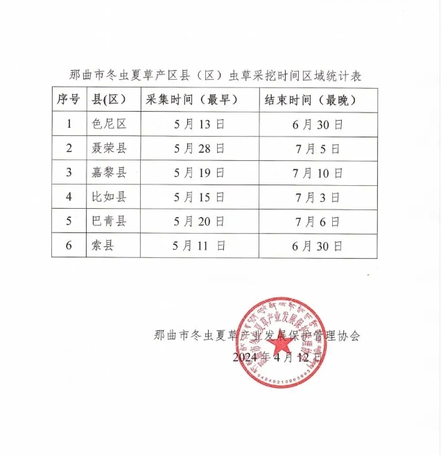 冬蟲夏草是在特殊氣候、特殊地理環(huán)境下發(fā)育形成的菌蟲復(fù)合體,那曲冬蟲夏草生長(zhǎng)在平均海拔4800m左右的高山上,因其生長(zhǎng)區(qū)域海拔高,冬蟲夏草采挖季節(jié)相比其他產(chǎn)區(qū)采集時(shí)間較晚,為維護(hù)“那曲冬蟲夏草”品牌聲譽(yù),保護(hù)產(chǎn)區(qū)農(nóng)牧民、經(jīng)營(yíng)者和廣大消費(fèi)者的合法權(quán)益,促進(jìn)那曲冬蟲夏草產(chǎn)業(yè)高質(zhì)量發(fā)展,現(xiàn)向社會(huì)告知2024年那曲市各縣(區(qū))冬蟲夏草采挖具體時(shí)間,請(qǐng)廣大消費(fèi)者謹(jǐn)記在這之前聲稱“新鮮那曲冬蟲夏草”的均屬冒充“那曲冬蟲夏草”行為,請(qǐng)廣大消費(fèi)者不要上當(dāng)。同時(shí),我協(xié)會(huì)倡議所有蟲草行業(yè)從業(yè)人員堅(jiān)決杜絕人工繁育蟲草冒充“那曲冬蟲夏草”欺騙消費(fèi)者的違法行為,堅(jiān)決杜絕以假亂真、以次充好的不法行為。