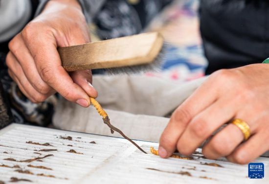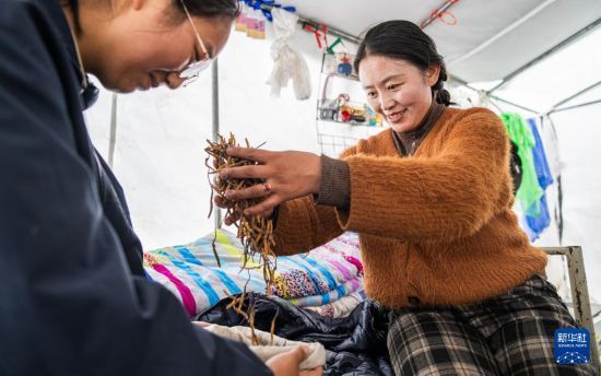 在那曲市索縣西昌鄉(xiāng),牧民將清理好的蟲草裝袋收納(5月18日攝)。新華社記者 丁增尼達(dá) 攝