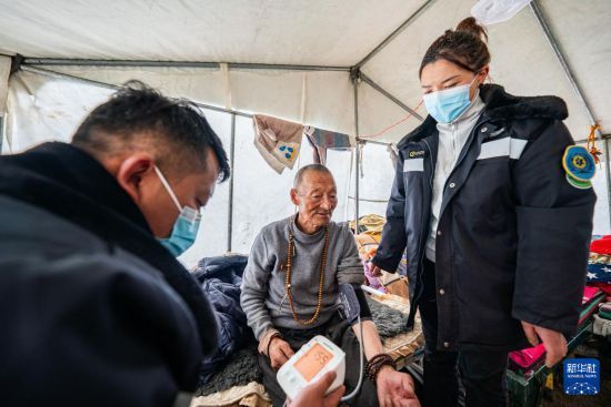 在那曲市索縣西昌鄉(xiāng),衛(wèi)生院醫(yī)務(wù)人員為蟲草採集點(diǎn)的牧民測量血壓(5月18日攝)。新華社記者 丁增尼達(dá) 攝